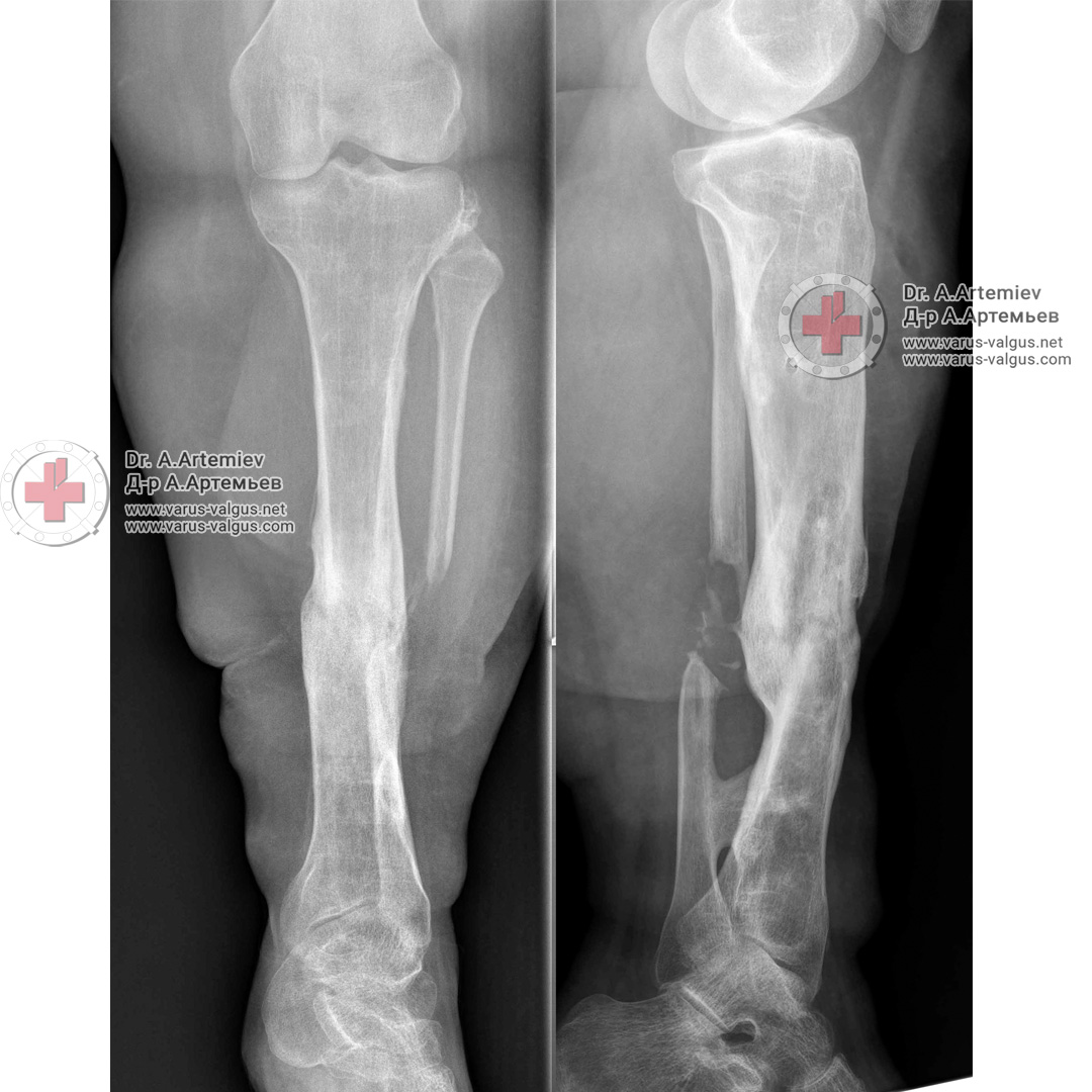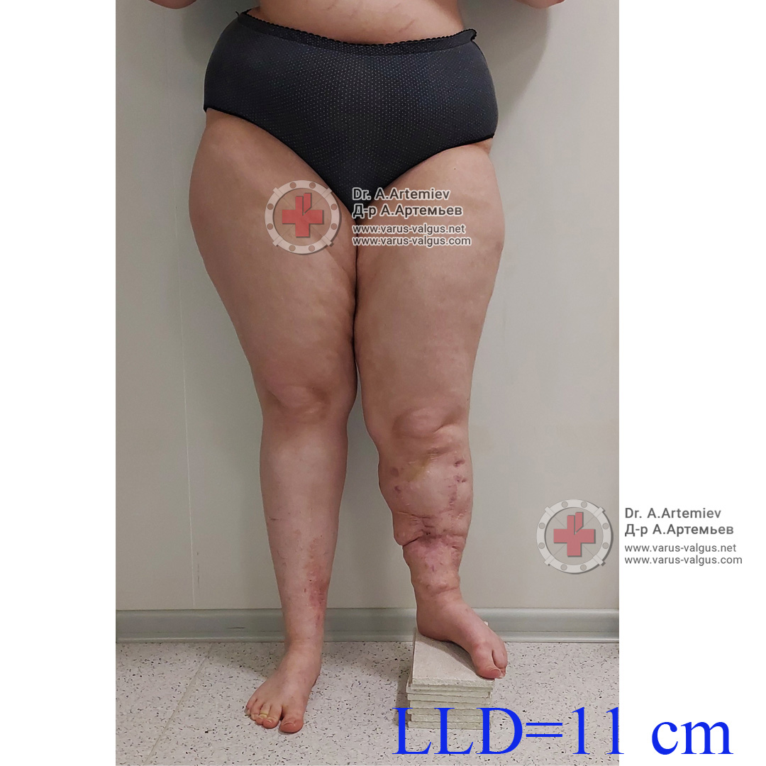 Девушка 18 лет. Получила травму несколько лет назад в результате падения с высоты. После нескольких операций голень срослась с укорочением 11 см, вальгусной деформацией и наружной ротацией.